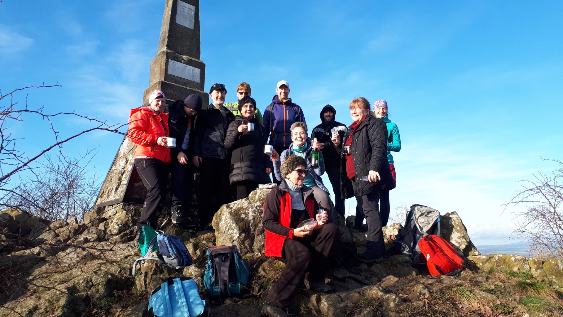 V pátek 30. prosince se uskutečnil další z našich tradičních předsilvestrovských výšlapů na Mužský, ke kterému jsou zváni zejména členové výboru či vedoucí našich akcí pro veřejnost. Bývá to vlastně takový výlet "za odměnu". Již tradičně se jeho organizace ujal Tomáš Trkola, který zvolil pro dosažení vrcholu netradiční cestu ze Žehrova. Autobusem jsme tedy v půl desáté dopoledne dojeli do zmíněné obce a odtamtud už jsme pěšky putovali kolem farmy v Arnošticích směrem k Příhrazům (jichž jsme ale nedosáhli, neboť jsme ještě před nimi uhnuli do skal po neznačené cestě). Nad Příhrazy jsme se napojili na turistickou trasu, po níž jsme došli k rozcestí Černá louže, odkud jsme začali opět stoupat nejprve po modré, posléze opět po neznačené cestě na Slivice a osadu Mužský. Již po silnici jsme se přiblížili pod nejvyšší vrchol naší části Českého ráje, který jsme zdolali zhruba v poledne. Dlužno podotknout, že nám po celou cestu přálo počasí, slunce zářilo jako o život, takže prosincový výlet připomínal spíše výlet jarní, zelené mechy se předháněly ve "svítivosti" a dostali jsme se i na místa dříve nenavštívená. Po celou dobu výletu panovala skvělá nálada, probíhaly ochutnávky cukroví i různých tekutin, vše poté završeno přípitkem na zdar našich akcí v roce 2023 na samotném vrcholu Mužský. Z něj pak směřovaly naše kroky do restaurace Na Krásné vyhlídce, kde jsme bohatě poobědvali a posilnili jsme se na sestup do Mnichova Hradiště. Prošli jsme přes Drábské světničky, zkontrolovali vyčištěné schody pod nimi (brigáda zde proběhla na konci listopadu) i nově vysázenou alej z Přestavlk do Dnebohu, do jejíž výsadby se někteří naši členové a příznivci také zapojili. Mnichovo Hradiště nás přivítalo po čtvrté hodině odpoledne již osvíceným náměstím, které nám dalo připomenout uplynuvší vánoční svátky i blížící se konec roku.