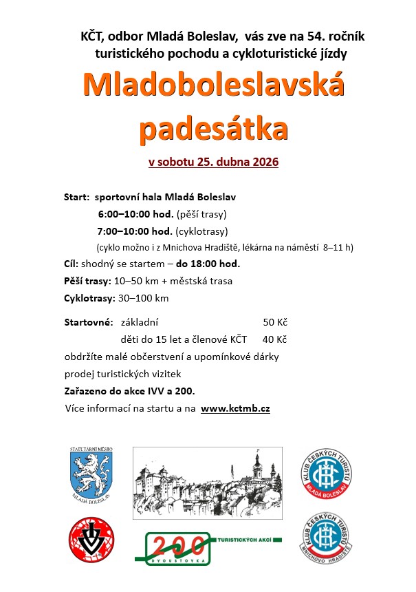 Klub českých turistů, odbor Mladá Boleslav zve v sobotu 25. 4. 2026 všechny zájemce z řad příznivců pěších i cyklistických výletů na 54. ročník Mladoboleslavské padesátky. Tato tradiční jarní turistická akce nabízí řadu různých tras pro chodce i milovníky jízdy na kole s možností startu buď v Mladé Boleslavi, nebo nově i v Mnichově Hradišti z lékárny na náměstí, a to v čase od 8 do 11 hodin.
