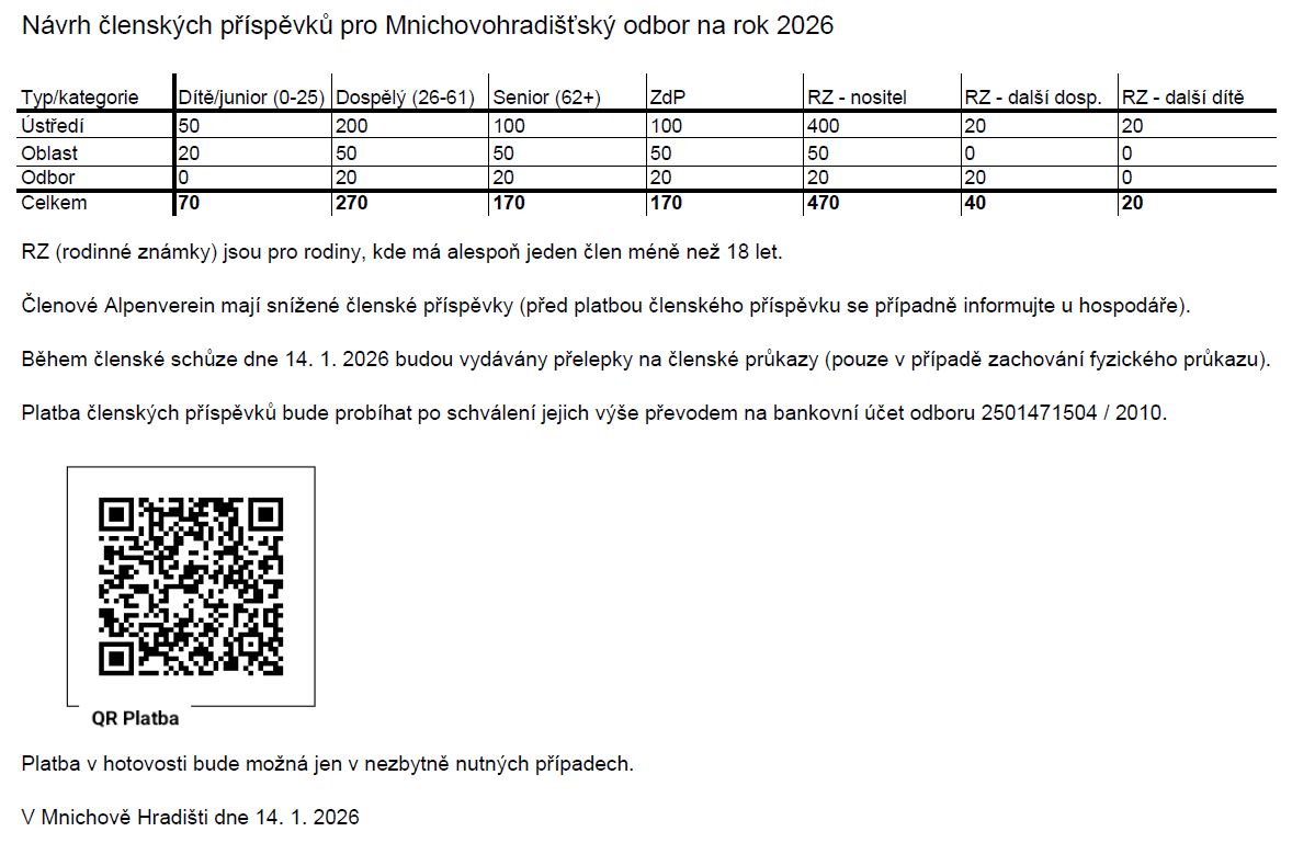 V příloze naleznete rozpis položek, které tvoří výsledný členský příspěvek. Dále také QR kód pro vaši rychlejší platbu. Přidávám též informaci o výhodách plynoucích ze členství v KČT (a nezalekněte se toho, že je tam uvedený rok 2025, jde o chybu).
