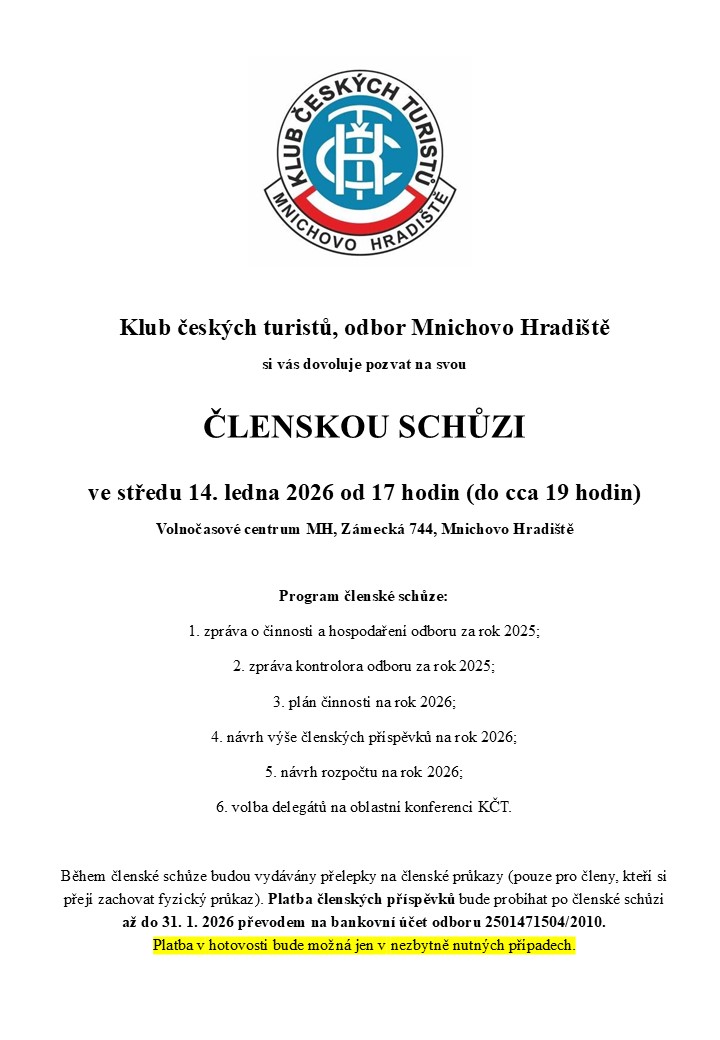Milí členové KČT, přijměte prosím jednak přání pevného zdraví do nového roku, jednak také pozvání na členskou schůzi, která se uskuteční ve středu 14. ledna 2026 od 17 h ve Volnočasovém centru MH v Zámecké ulici. Bližší informace o programu naleznete v níže přiložené pozvánce. Těšíme se na vaši účast. Drobné občerstvení bude zajištěno, leč z vaší strany také vítáno.