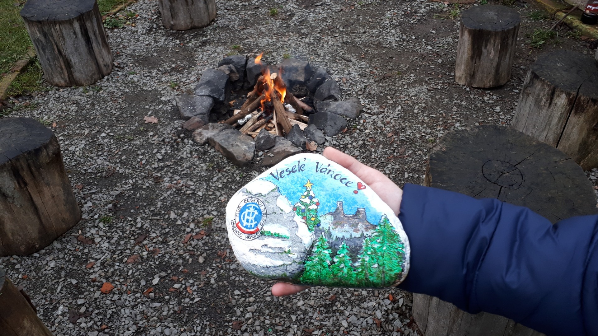Sobotní dopolední počasí (20. prosince 2026) příliš nenahrávalo výletu, ale naštěstí se umoudřilo a ranní déšť a dopolední mrholení po obědě zcela ustaly. Ve dvě hodiny odpoledne jsme tedy mohli vyrazit na trasu čítající cca tři a půl kilometru – cesta vedla alejí ke Káčovu, podél bažantnice a poté na Sychrov. Kopírovala trasu, na níž byly den předtím uloženy kamínky s vánočními motivy. Bylo potěšující, že jsme jich cestou ještě pár našli. Stejně tak i na samotné Zásadce jich pak bylo pár k nalezení, což udělalo radost našim dětským účastníkům. Hradní pán Jirka Plaček se opět činil, místo nám nádherně vyzdobil, k dispozici jsme měli samoobslužný bar se svařákem i horkým jablečným moštem a jeho vlastnoručně upečenými dobrotami. Ani my jsme se nenechali zahanbit, stůl se doslova probíhal pod různými druhy cukroví či dalšími laskominami, došlo i na ochutnávku domácího vaječňáku či karibského rumu. Betlém byl kouzelný, navíc nám vyhrával vánoční koledy, atmosféra byla tedy vpravdě vánoční. Oheň plápolal, buřty tedy byly doslova nutností. Všichni se skvěle bavili, navíc se náš počet rozrostl o ty, kteří na místo dorazili již dříve či z jiných směrů a nebo naopak později. 36 se nás na Zásadce sešlo, ale ne všichni jsou zvěčněni na fotografii. Večerní cesta lesem za tmy pak byla třešničkou na dortu pro všechny odvážlivce.